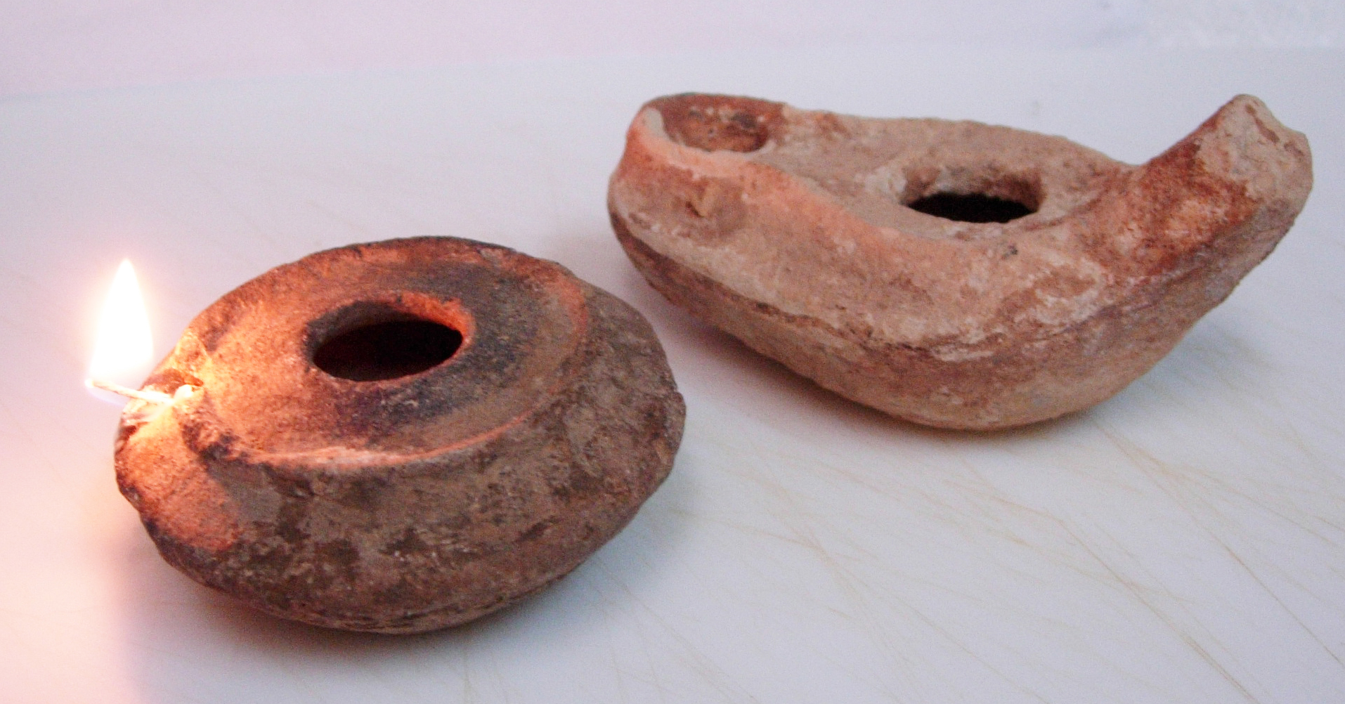 Roman era oil lamps, each would fit in the palm of one's hand. Olive oil (or another oil) is poured into the hole in the center. Then a wick made of twisted reed or other material is placed in the end and lit.